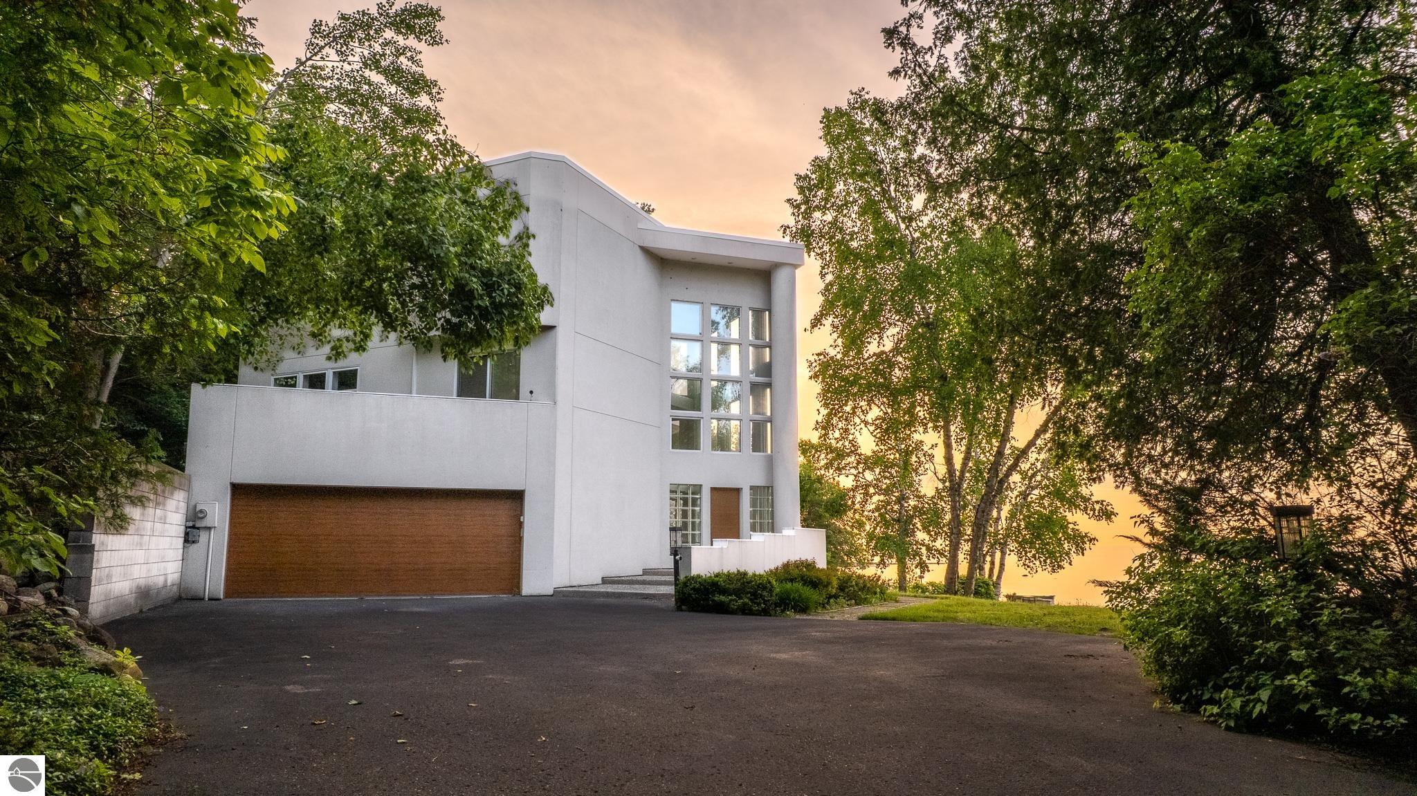 A stunning 21st-century contemporary residence overlooking Little Traverse Bay on Lake Michigan. This 5-bedroom, 4-bathroom home embodies modern elegance, highlighting open spaces, uninterrupted viewpoints, and an abundance of natural light. Nestled along 499 feet of private, deeded Lake Michigan frontage, on almost two acres, this home is positioned to capture breathtaking sunset views over the lake. Expanding 4,600 square feet, the interior is thoughtfully designed to harmonize with the surrounding landscape. Lofted ceilings, floor-to-ceiling windows, and a seamless open-concept layout create an airy and sophisticated atmosphere. The modern kitchen boasts sleek cabinetry & high-end stainless steel appliances, perfect for entertaining. A gas fireplace anchors the living area, offering warmth and ambiance against the backdrop of expansive lake views. The primary suite is a private retreat, featuring panoramic water views, a spa-inspired ensuite, and a generous walk-in closet. Additional bedrooms provide ample space for guests or a growing family, while the upper-level family room offers a versatile gathering space. Designed for privacy and tranquility, this property includes an extra wooded lot between the neighboring property, ensuring seclusion. Step outside to enjoy the expansive deck and patio area, creating the perfect setting for outdoor relaxation and entertaining. An attached two-car garage adds convenience to this thoughtfully designed home. Ideally located between Charlevoix and Petoskey, this lakefront masterpiece offers a rare combination of contemporary luxury, natural beauty, and premier location. Custom designed by In-design architectural group, don't miss your chance to own this piece of Northern Michigan’s lakefront paradise.